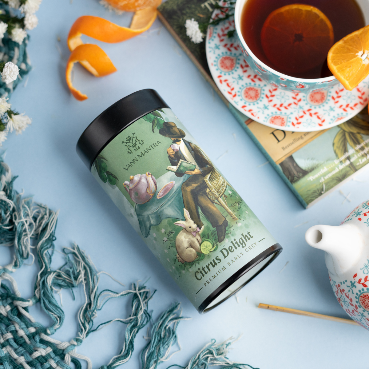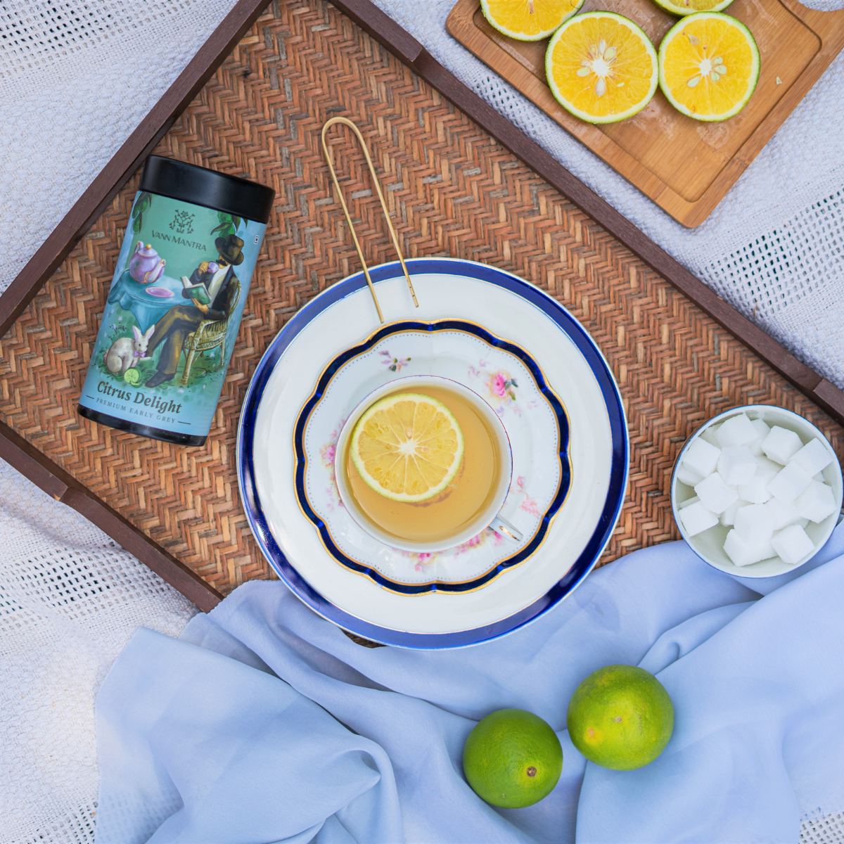 Citrus Delight- Premium Earl Grey Tea in front of a brick wall